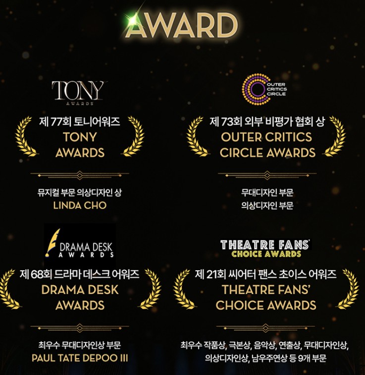 드라마 데스크 어워즈 최우수 무대디자인상 부분 수상, 토니어워즈 뮤지컬 부문 의상디자인상 수상과 빌보드 CAST 앨범 부문 1위 차지까지! 화려한 코스튬과 환상적인 특수효과로 가득 찬 매력적인 무대를 경험해 보시기 바랍니다!