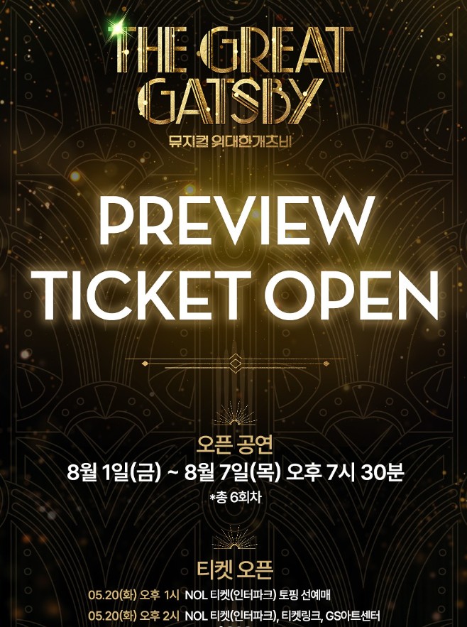 뮤지컬 『위대한 개츠비』 서울 오리지널 프로덕션의 예매는 2025년 5월 20일(화) 오후 2시부터 시작되며, 프리뷰 공연에 한해 일부 좌석 할인이 적용됩니다. 조기 매진 예상으로 지금 바로 잔여석 확인해 보세요!