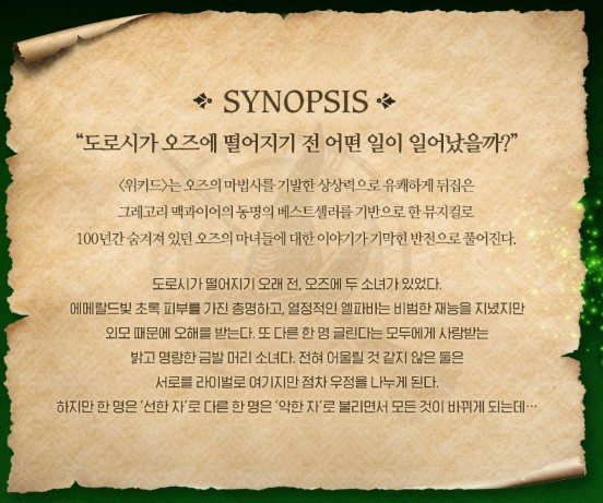 A. <오즈의 마법사> 이전의 이야기로, 초록 마녀 엘파바와 금발 마녀 글린다의 우정과 대립을 중심으로 전개되는 판타지 뮤지컬입니다.