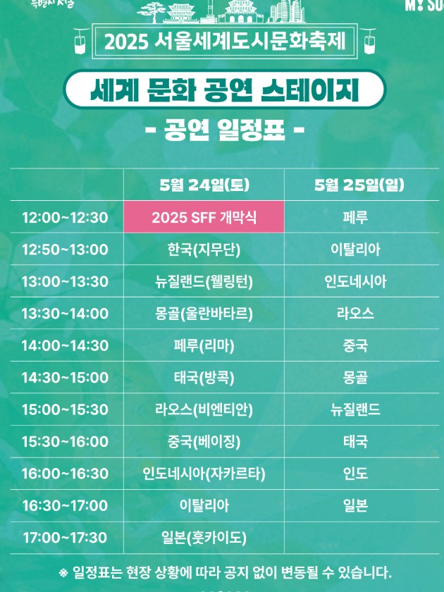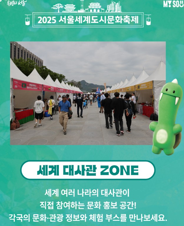 5월 24~25일 단 이틀간만, 서울 한복판에서 지구촌이 하나 되는 글로벌 축제가 열립니다! 입장료도 무료라 안 가면 나만 손해! 67개국 전통의상·음식·공연·사진전까지, 가족, 연인, 아이랑 특별한 추억을 만들고 싶으시다면 2025 서울세계도시문화축제(Seoul Friendship Festival 2025)로 전 세계 문화를 경험할 수 있는 동대문디자인플라자(DDP)를 방문해 보시기 바랍니다!