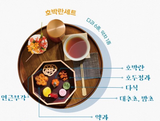 - ① 호박란 세트: 호박란, 연근 부각, 다식, 약과, 대추초·밤초, 호두정과
