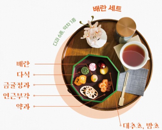 올해는 다과 세트를 2종 중 선택할 수 있으며, 한방차도 4종 중 하나를 골라 즐길 수 있어 더 풍성해졌습니다.