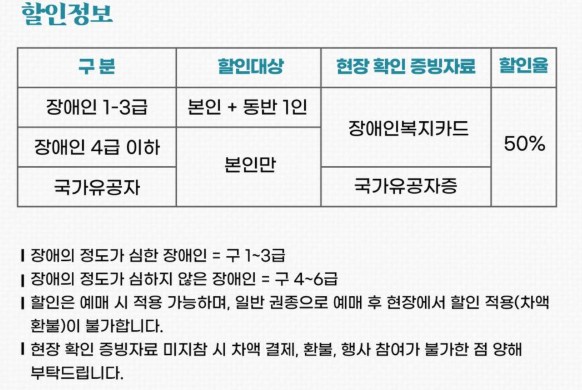 ✔ 장애인 할인 - 1~3급: 본인 포함 2인까지 50% 할인 - 4급 이하: 본인 1인 50% 할인