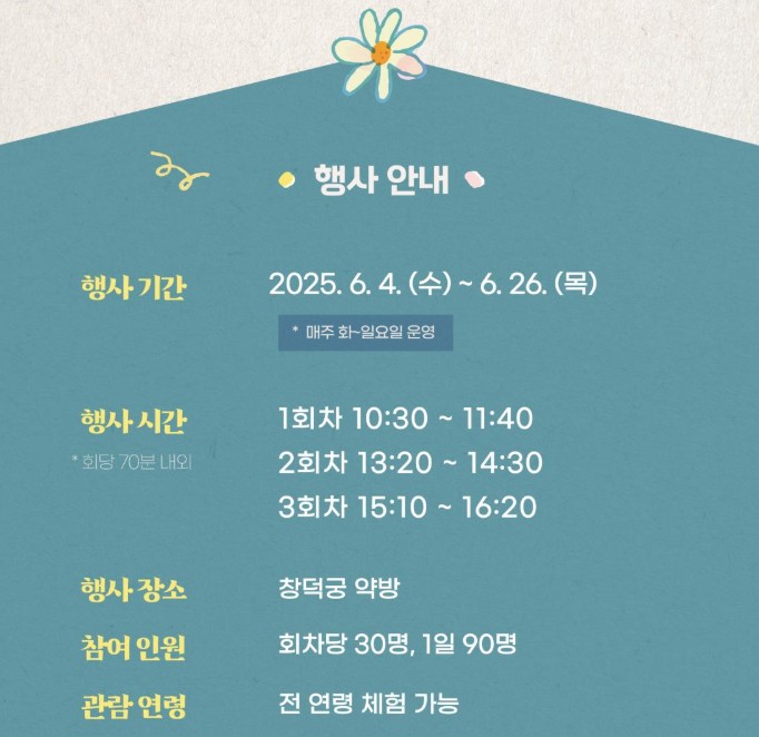 전통과 힐링이 만나는 궁중 다과 체험, ‘창덕궁 약다방’이 돌아왔습니다! 2025년 6월 4일부터 단 3주간만 진행되는 이번 프로그램은 궁중 다과와 한방차, 전통 해설까지 더해진 고품격 경험으로 주목받고 있습니. 작년에는 사회적 배려 대상자 초청으로만 진행되었던 프로그램이 올해는 일반 관람객에게도 공개됩니다. 5월 18일 오후 2시까지만 추첨예약 가능하니 지금 바로 응모하세요👇