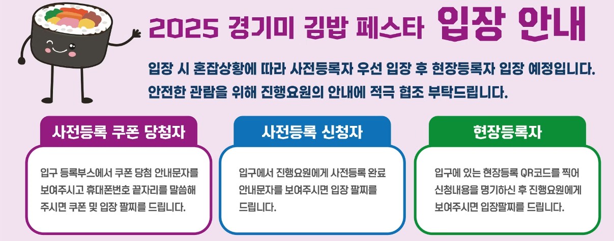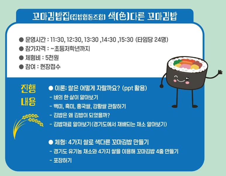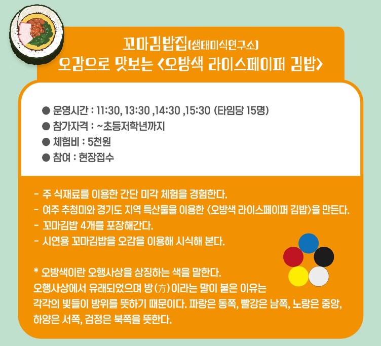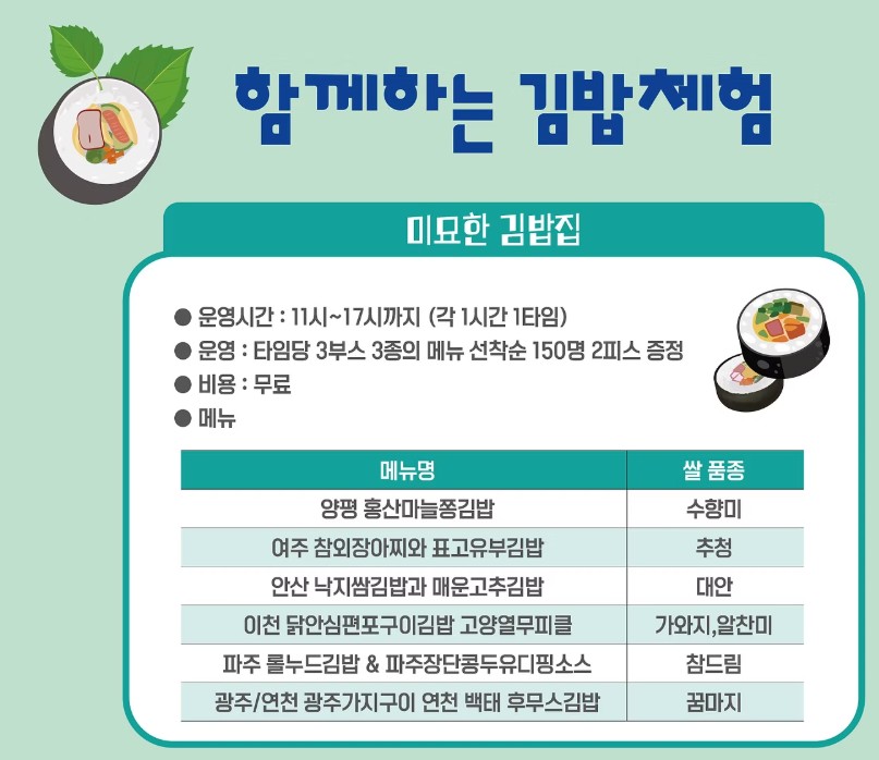 - 김밥을 직접 만들고 먹을 수 있는 체험 부스는 조기 마감될 수 있음