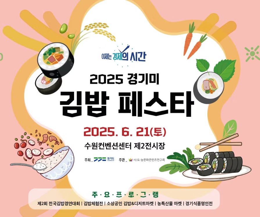 전국 김밥고수들의 특별한 김밥을 맛볼 수 있는 제2회 2025 경기미 김밥 페스타가 수원에서 열립니다. 축제는 2025년 6월 21일 단 하루 열리며, 사전 등록은 마감됐지만, 현장 등록 가능! 한국인의 소울푸드 김밥을 사랑한다면, 김밥을 좋아하는 초등학생 자녀가 있다면! 절대 놓쳐선 안 되는 맛과 체험의 페스티벌에 참여해 보세요!