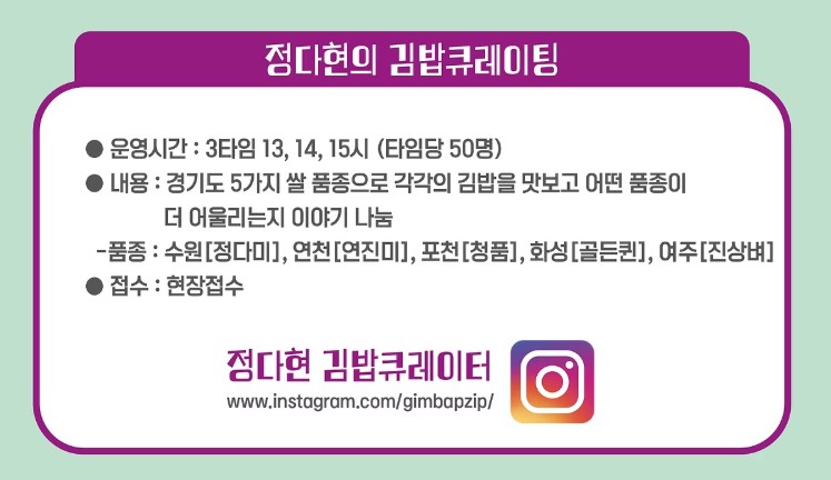 경기도 각 지역의 쌀과 식재료로 만든 특별한 김밥을 현장에서 무료로 맛볼 수 있어 놓치면 정말 아쉬운 시간!