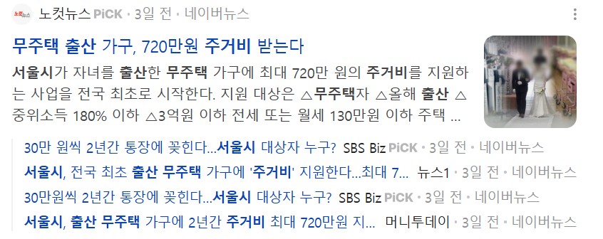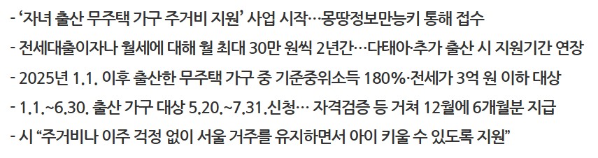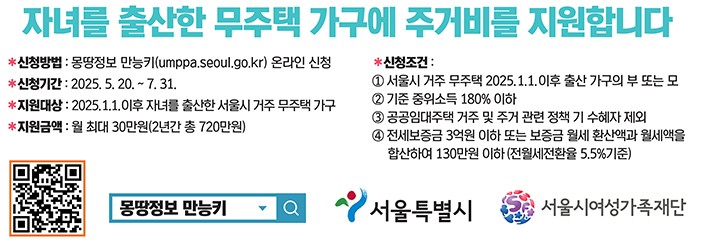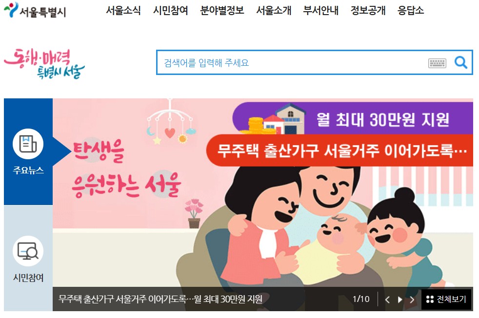 서울시는 무주택 출산가구에 월 최대 30만 원의 주거비를 2년간 지원합니다.