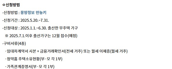 신청 조건을 꼼꼼히 확인하시고 해당되는 무주택 가정이라면, 2025년 5월 20일부터 접수 시작이니 무주택 출산 가구 주거비 지원금! 절대 놓치지 마시고 지금 바로 신청하세요!