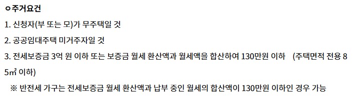 - 전세보증금 3억 이하, 월세 130만 원 이하 주택 거주