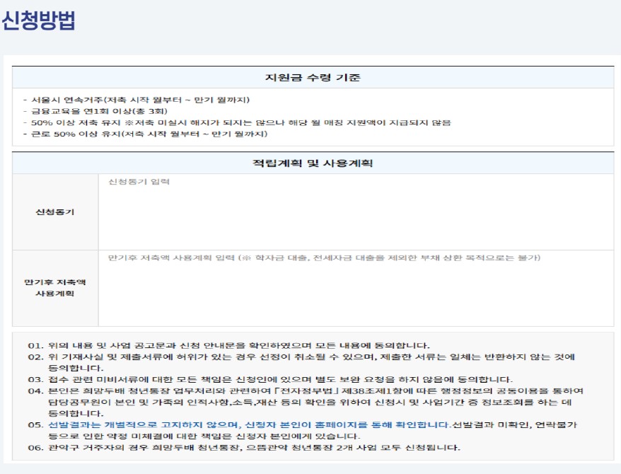 - 유사 자산형성 지원사업(희망키움통장, 서울시 저소득층 희망플러스 통장 등) 중복참여 불가